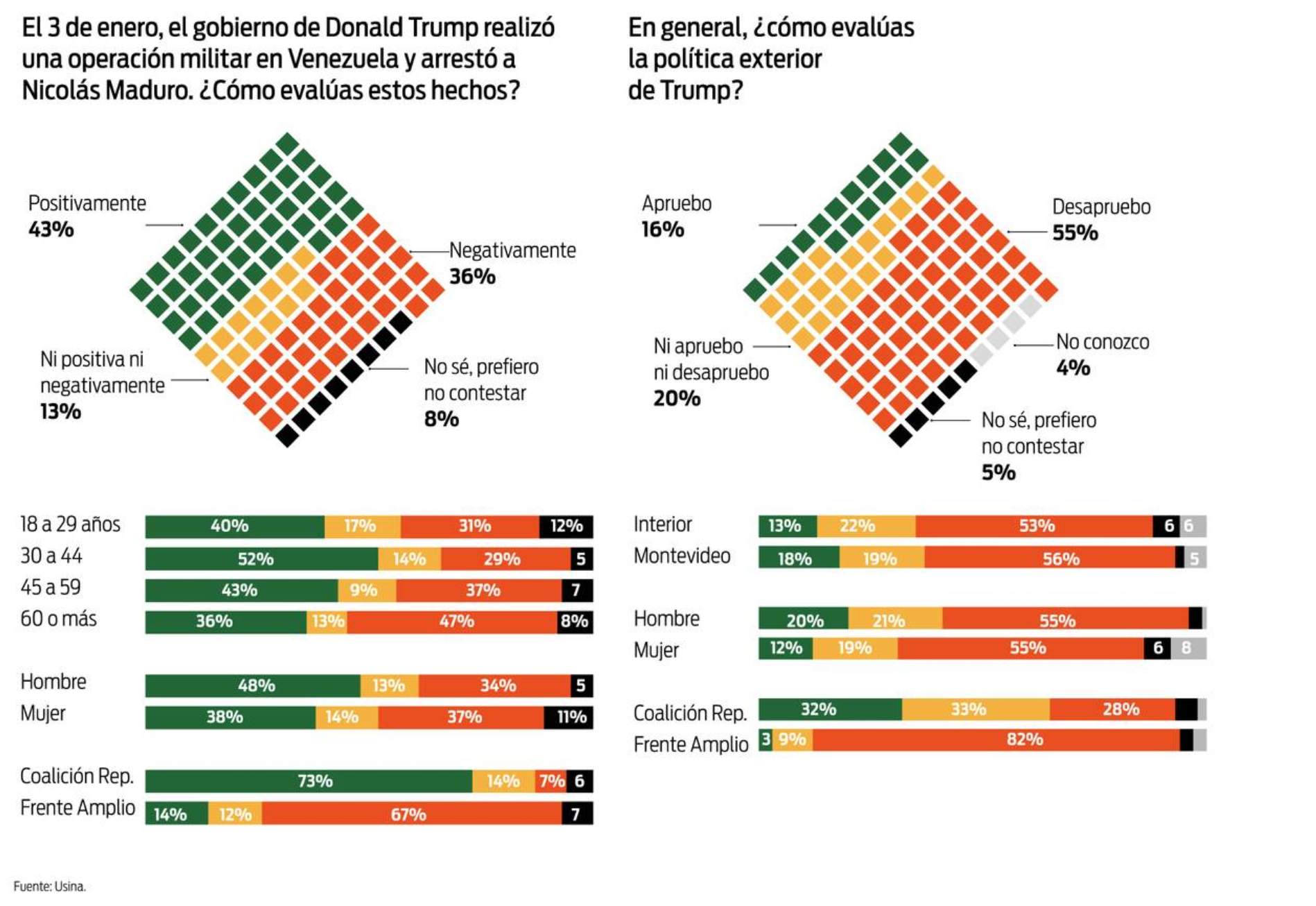 3/2/26 El 43% de los uruguayos evalúan positivamente la operación estadounidense en Venezuela que sacó a Maduro del poder, de acuerdo con una encuesta de la Usina