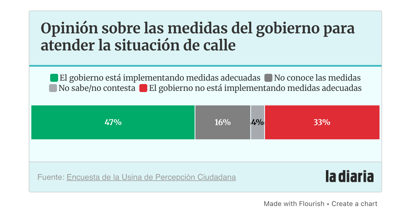 Según un relevamiento de la Usina de Percepción Ciudadana realizado entre el 27 y el 30 de junio, el 81% de las personas considera que el número de personas en situación de calle ha aumentado, mientras el 12% opina que se ha mantenido constante, el 2% cree que ha disminuido y el 5% no sabe o no contesta.